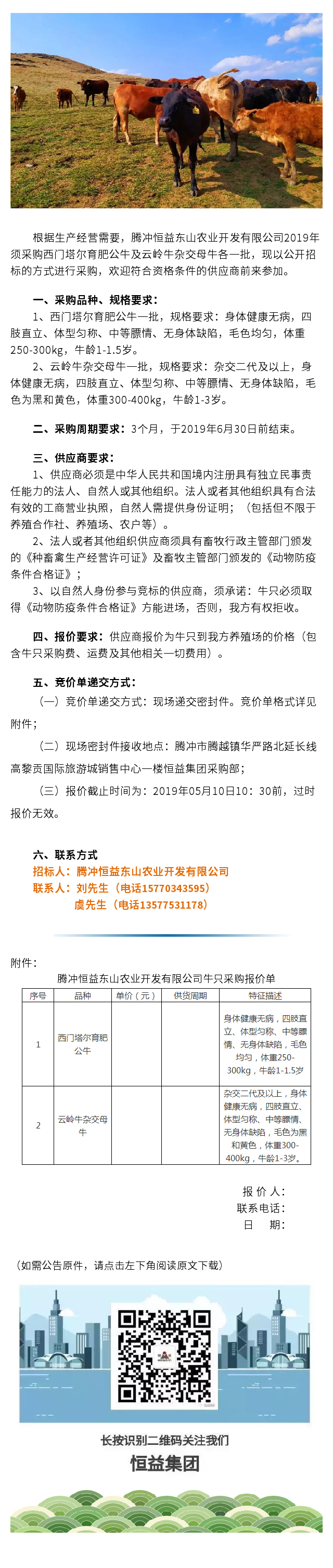 騰沖恒益東山農業開發有限公司牛只采購競價招標公告 來源: 瀏覽量:11064 日期:2019-04-18 分享到: 上一篇:騰沖東山康養國際旅居小鎮學府雅苑智能安防系統工程施工招標公告 下一篇:騰沖市恒益公司關于鋅精礦競價銷售公告(201902)號