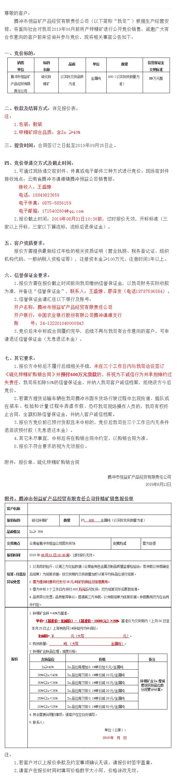 騰沖市恒益礦產(chǎn)品經(jīng)貿(mào)有限責(zé)任公司關(guān)于鋅精礦競(jìng)價(jià)銷售公告(201905)號(hào) 來(lái)源: 瀏覽量:11325 日期:2019-08-13 分享到: 上一篇:騰沖市恒益礦產(chǎn)品經(jīng)貿(mào)有限責(zé)任公司關(guān)于鋅精礦競(jìng)價(jià)銷售公告(201905)號(hào) 下一篇:高黎貢國(guó)際健康旅居小鎮(zhèn)低層住宅八組團(tuán)—江山小院門頭及圍墻工程招標(biāo)公告