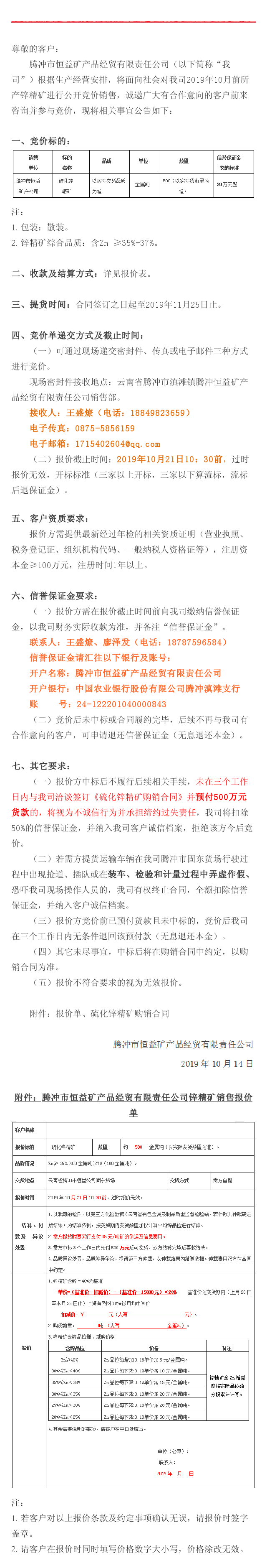 騰沖市恒益礦產(chǎn)品經(jīng)貿(mào)有限責(zé)任公司關(guān)于鋅精礦競(jìng)價(jià)銷售公告(201905)號(hào) 來源: 瀏覽量:10824 日期:2019-10-14 分享到: 上一篇:騰沖市恒益礦產(chǎn)品經(jīng)貿(mào)有限責(zé)任公司關(guān)于鋅精礦競(jìng)價(jià)銷售公告(201910)號(hào) 下一篇:騰沖市恒益礦產(chǎn)品經(jīng)貿(mào)有限責(zé)任公司關(guān)于鋅精礦競(jìng)價(jià)銷售公告(201905)號(hào)