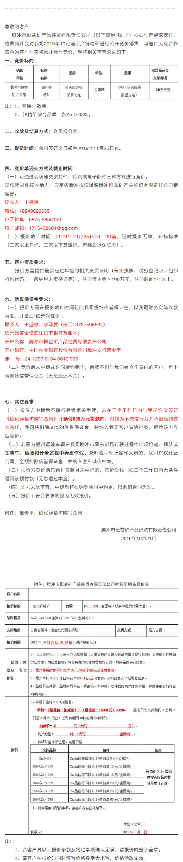 騰沖市恒益礦產品經貿有限責任公司關于鋅精礦競價銷售公告(201910)號 來源: 瀏覽量:10921 日期:2019-10-22 分享到: 上一篇:騰沖市恒益礦產品經貿有限責任公司關于鋅精礦競價銷售公告(201911)號 下一篇:騰沖市恒益礦產品經貿有限責任公司關于鋅精礦競價銷售公告(201905)號