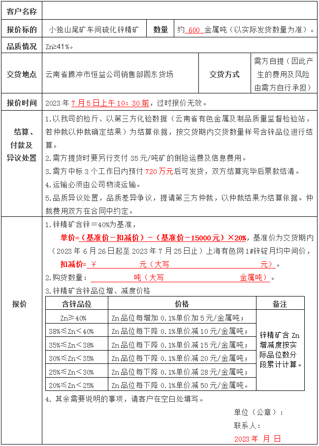 附件:騰沖市恒益礦產品經貿有限責任公司鋅精礦銷售報價單