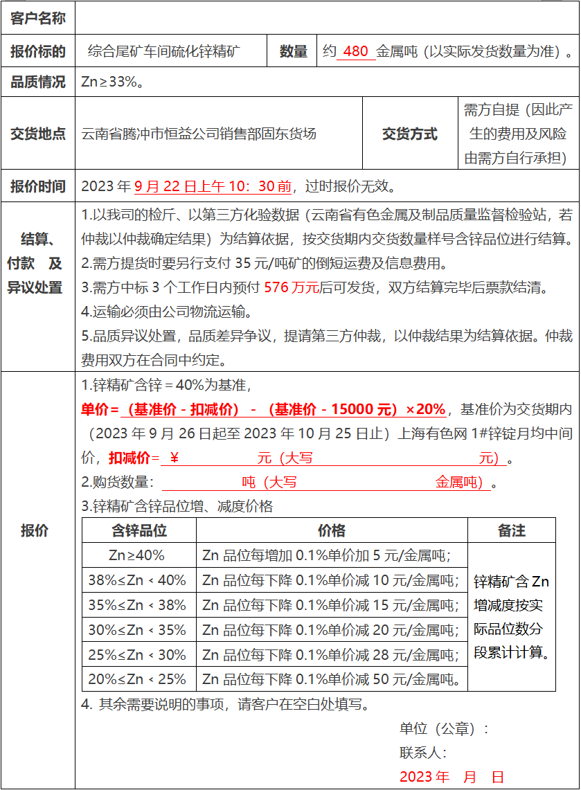 騰沖市恒益礦產品經貿有限責任公司(以下簡稱“我司”)根據生產經營安排,將面向社會對我司2023年9月前所產鋅精礦進行公開競價銷售,誠邀廣大有合作意向的客戶前來咨詢并參與競價,現將相關事宜公告如下: