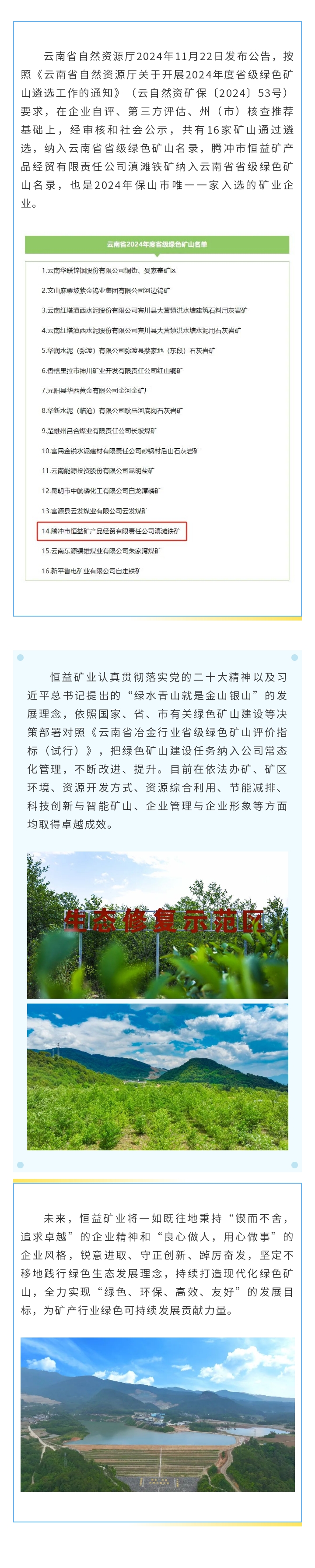 恒益礦業滇灘鐵礦成功入選云南省省級綠色礦山名錄 來源: 瀏覽量:4840 日期:2024-11-25 分享到: 上一篇:恒益集團“薪火計劃2.0”:專業打磨與管理優化并行,驅動持續發展新引擎 下一篇:喜訊!恒益集團獲得“2024云南企業100強”等多項榮譽獎項