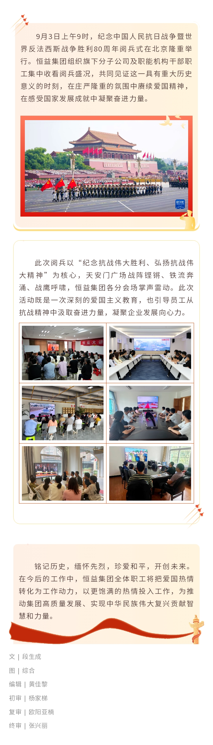銘記榮光,凝聚力量丨恒益集團組織集中收看抗戰勝利80周年閱兵盛況 來源: 瀏覽量:2434 日期:2025-09-03 分享到: 上一篇:恒益集團濱鯤中智與猴橋鎮簽約 共筑高原高端淡水魚養殖基地 下一篇:恒益集團受邀參加“緬甸·中國經濟合作促進交流會”,簽署兩項合作諒解備忘錄