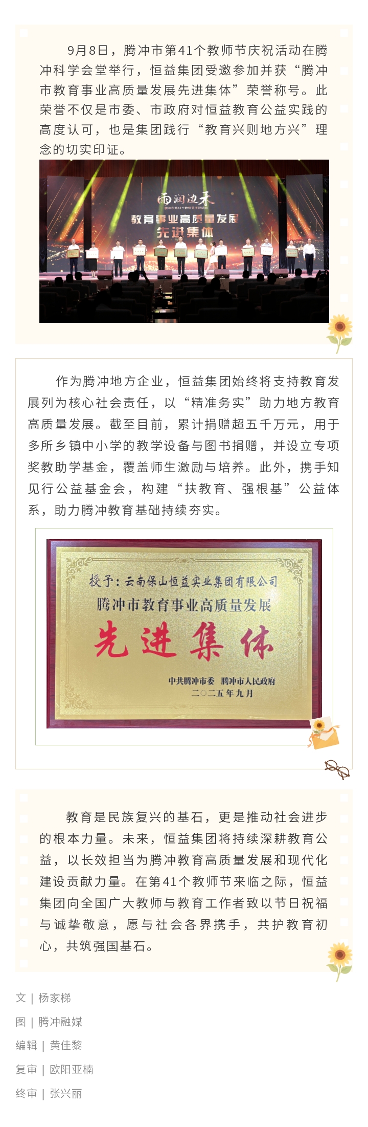 喜訊丨恒益集團榮膺2025年“騰沖市教育事業高質量發展先進集體”稱號