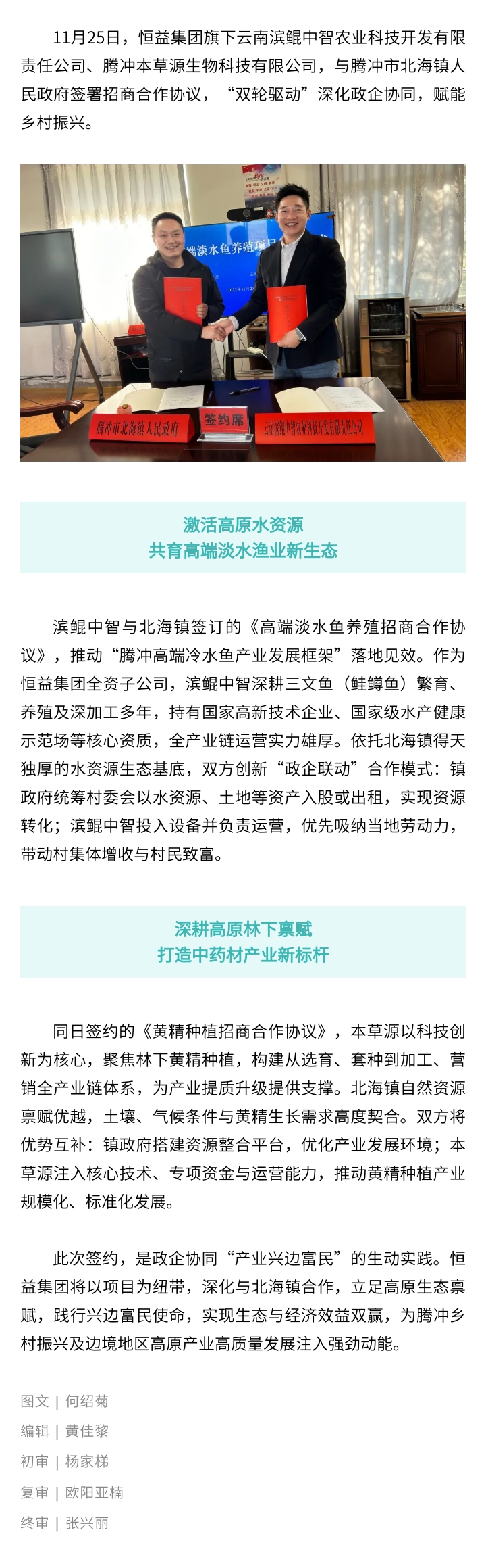 恒益集團雙項目簽約北海鎮,政企攜手打造高原農業特色 來源: 瀏覽量:1445 日期:2025-11-25 分享到: 上一篇:溫泉中醫賦能旅居云南,旅居與醫康養創新發展論壇重磅嘉賓及議程公布 下一篇:邀請函 | 2025騰沖科學家論壇·旅居與醫康養創新發展論壇即將盛大啟幕