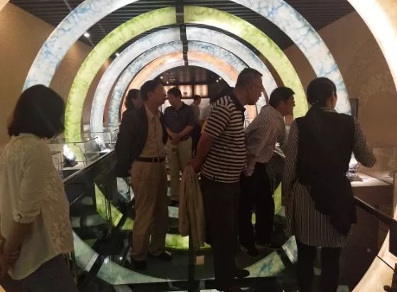 期間,調研組一邊聽取工作人員介紹館內設計理念,一邊仔細查看各藏品的擺放、空間設計等情況,對博物館的創意理念、設計表示贊許,并建議要多將科技產品與展品進行結合,讓前來參觀的嘉賓有更好的直觀體驗,充分利用好博物館內部空間,多方位展示特色,特別是對具有歷史意義的藏品展示方面,更凸顯出騰越翡翠文化的魅力。